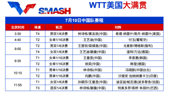 7月10日,王楚钦与孙颖莎将分别领衔国乒双打阵容,王楚钦搭档梁靖崑在北京时间上午9:00迎战智利组合博格斯/戈麦斯,这对中国组合肩负着为国乒男双正名的使命;孙颖莎与王曼昱组成的“莎曼”组合将在11:55迎来首秀,对手是跨国组合迪亚兹(波多黎各)/帕瓦德(法国),作为世界顶尖女双搭档,她们的表现备受期待;王艺迪/蒯曼组合也将在同一时段亮相,对阵德国组合温特/万远,三对双打齐发,国乒在双打项目的整体优势有望全面展现